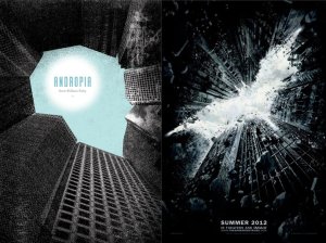“The new Dark Knight film released a poster yesterday that is very similar to my book cover for Foley’s ANDROPIA, which I designed in 2008/2009. My cover features a sideview of a human head with the sun located in the brain area. The Dark Knight poster uses the same concept but with some slightly more photorealistic graphics and the sky in the shape of the Batman symbol. They probably didn’t rip me off; the chances they saw my cover are very small. Pretty interesting, though!”
