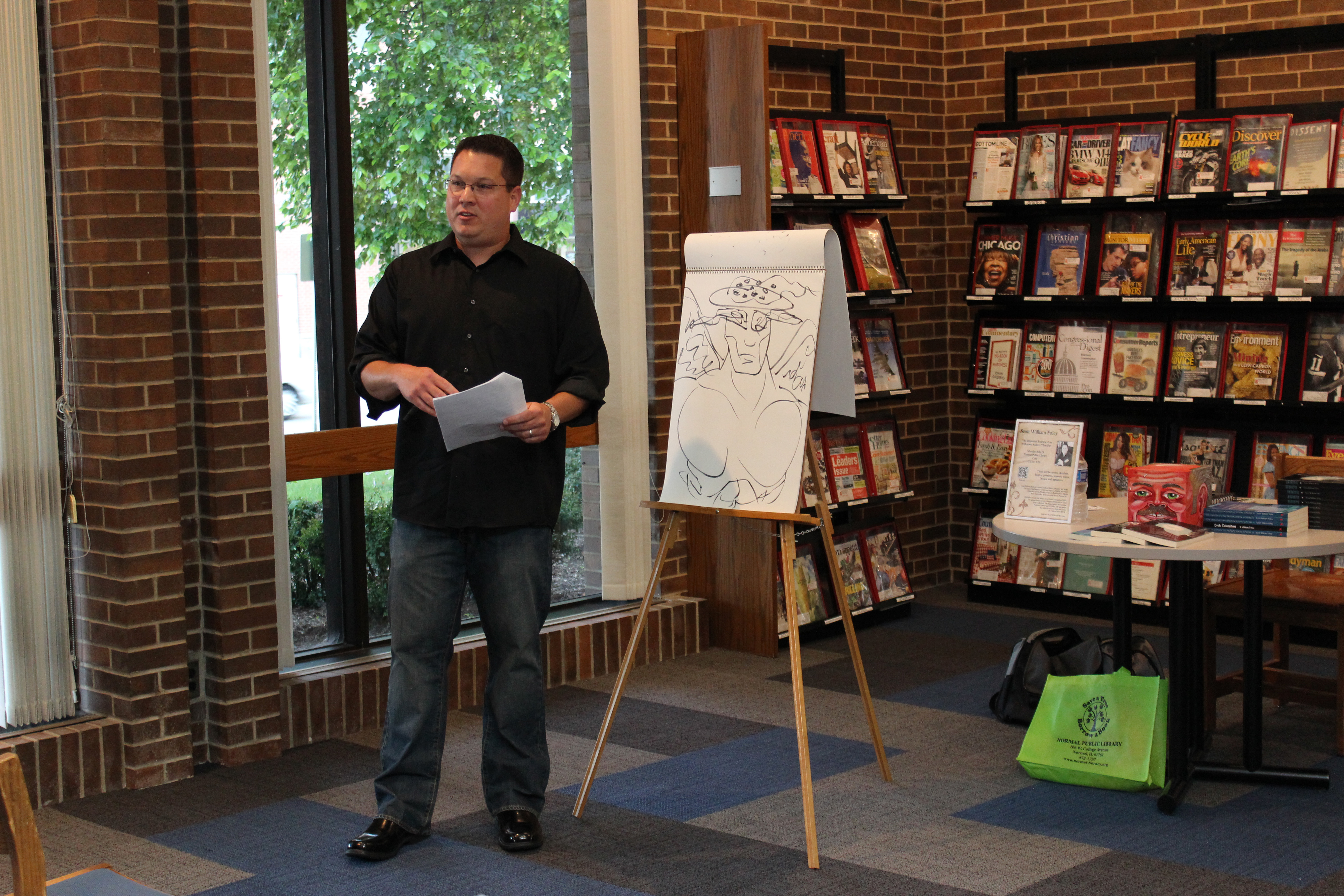 On July 14, 2014, I had the honor of speaking to an audience at the Normal Public Library in Illinois. I decided to make things interesting by not only talking about my journey as an author, but by illustrating the journey. I’ve never before sketched in front of a large audience, but it went very well. I had a fun time, and I think the audience did, too.