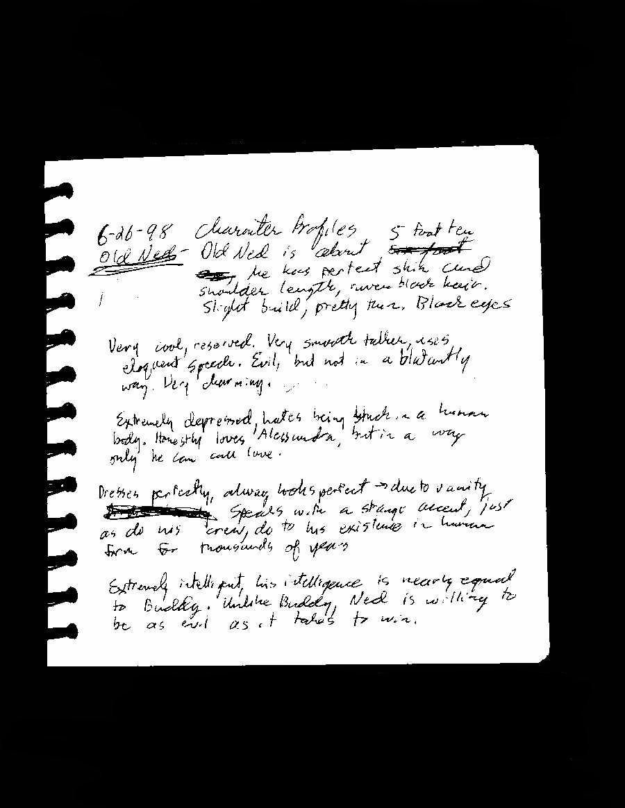 This is my first sketch of the incredibly handsome, and villainous, Ned from my novel Souls Triumphant. This character is one of my all-time favorites, and I’m not really sure what that says about me. He was originally conceived for a short story back in my creative writing class at Illinois State University. These notes are from the 1998 journal I used in the class to flesh out ideas.