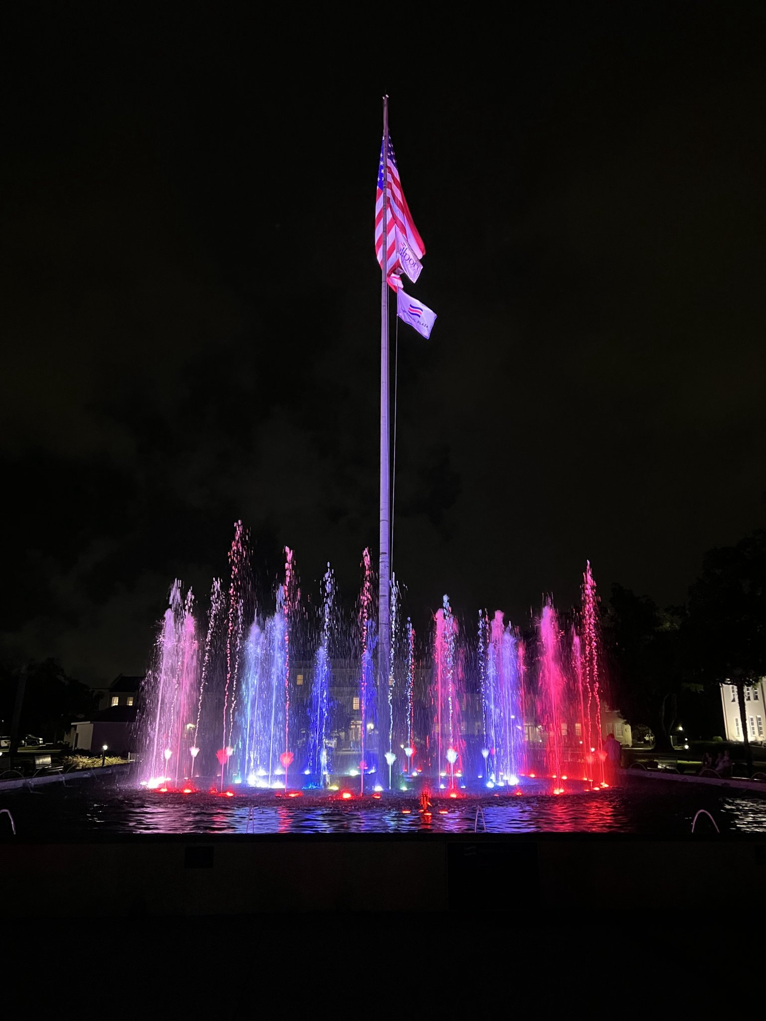 Finally, Centennial Plaza has a wonderful fountain that lights up at night while spraying water in coordination with music playing. Here’s a picture we took.